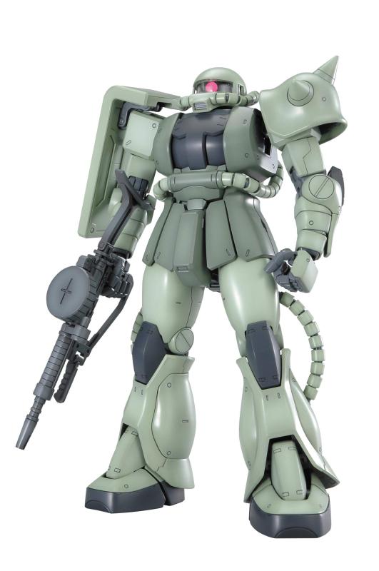 「機動戦士ガンダム」より、MGシリーズにモビルスーツの開発系譜を意識した“ザク”のVer.2.0が登場! ねじれや各部のリンク可動により、前屈みポーズなどこれまで取る事のできなかった、新たな可動領域を再現 ショルダーアーマーのインナーフレームを再現、外郭は一体成型でスパイクを再現 コクピットハッチは両側とも開閉し、背面側レバー操作により、コクピットシートが左右に可動 カメラアイは首の可動にリンクした視線移動ギミックを搭載 ザク・マシンガン、ザク・バズーカ、ヒート・ホーク、脚部3連装ミサイルポッドなど代表的な地上装備が付属