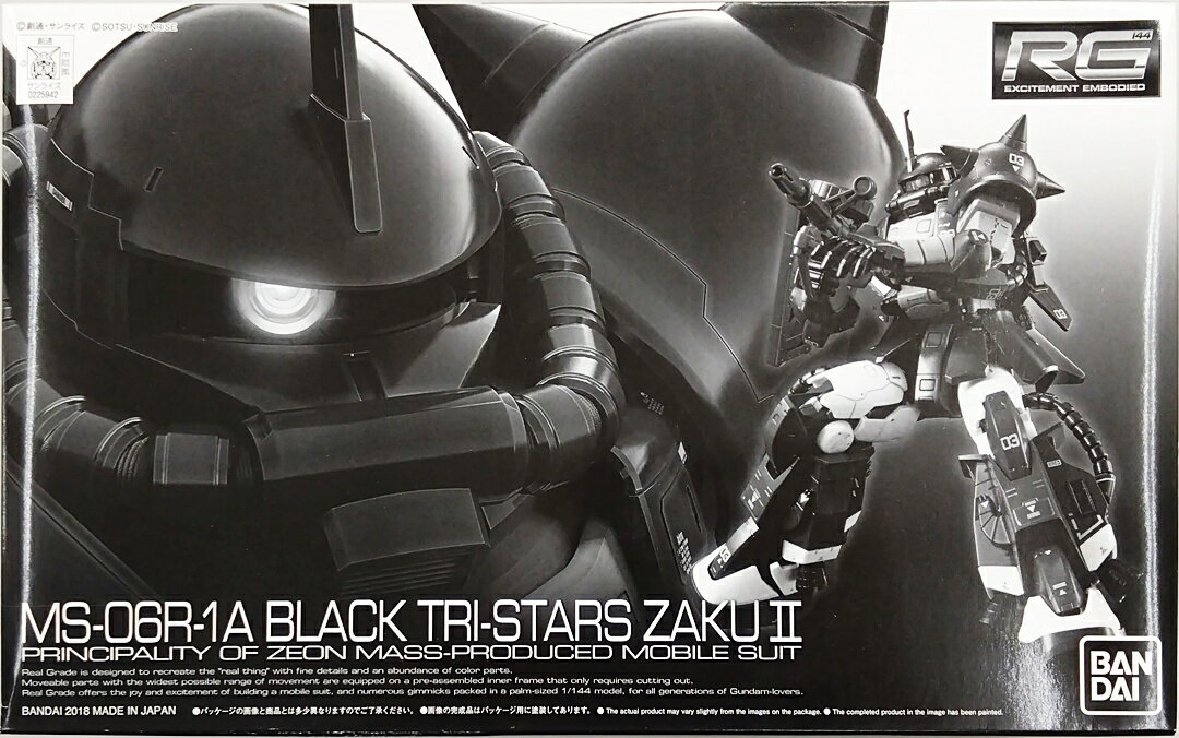 - 「黒い三連星」リアルグレードで登場 - 『機動戦士ガンダムMSV』より、MS-06R-1A 黒い三連星専用ザクIIを、1/144では類をみない細密表現と”リアル”を追求したRGシリーズで商品化。 ● 黒い三連星機のカラーリング、機体形状を徹底再現! ひじ、脚部の燃料カートリッジといった黒い三連星機のMS各部位を再現。 特徴的な機体色を色調の異なる、複数の成形色で再現。 ガイア機と、オルテガ及びマッシュ機の頭部を選択式で再現可能。 ● ガイア、オルテガ、マッシュ、それぞれのマーキングを収録した、新規リアリスティックデカール付属! ● 06R―1Aの各種武装が付属! ジャイアント・バズ、ザク・マシンガン、ザク・バズーカ、ヒート・ホークといった各種武装をRG準拠で再現。 付属武装 : ザク・バズーカ / ザク・マシンガン / ヒート・ホーク / ジャイアント・バズ -----------------------------------------1/144スケール組み立て式プラモデル対象年齢:15才以上製品素材:PS・PP・ABS・組み立てに接着剤は使用しません----------------------------------------- ※写真の完成品は開発途中の試作品です。また、塗装してあります。実際の商品とは多少異なる場合がございます。 (備考) ・ この商品は、プラモデルお取り扱い店舗店頭ではお買い求めいただけません。 ・ この商品は、弊社主催イベントや他の企画、海外などで販売をさせていただく場合がございます。 ・ この商品は‘プレミアムバンダイ’での販売準備数に限りがございます。品切れの際はご了承ください。 ・ この商品は、生産準備数の都合により、お一人様につきご購入いただける数量を限らせていただいております。 ご了承ください。 ・ この商品は、お申込状況、生産の都合により、発送日が変更となる場合がございます。予めご了承ください。 ・ 商品画像は開発途中のものであり、実際の商品とは異なる場合がございます。 ・ 商品仕様は2017年12月現在の予定です。変更の場合もございますがご了承ください。